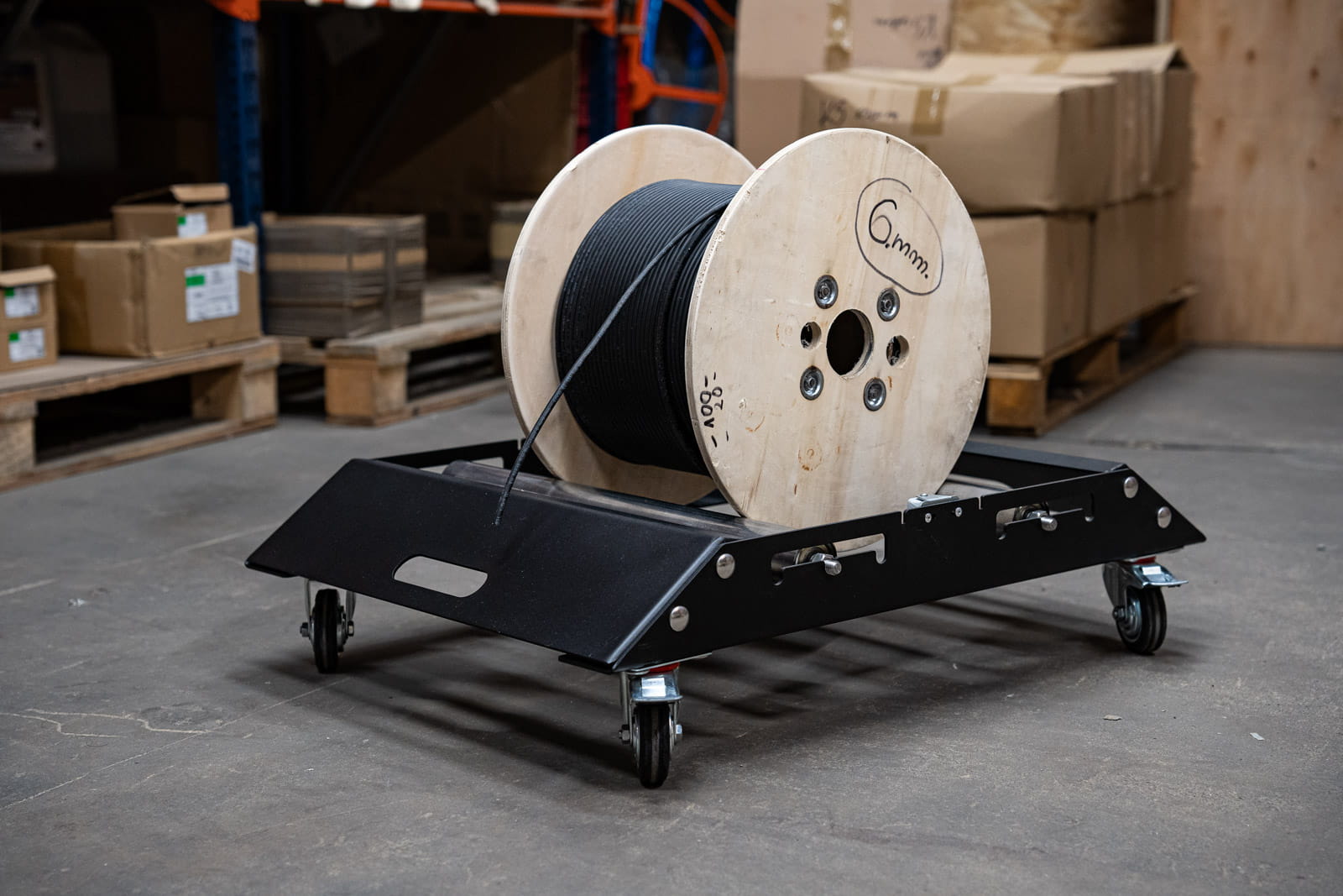 3. Przemysłowe rolki: Każdy model posiada wytrzymałe rolki z pełną, obustronnie łożyskowaną osią, co zapewnia płynne odwijanie kabli o różnej średnicy. Dodatkowe boczne kółka stabilizują bęben na rolkach.